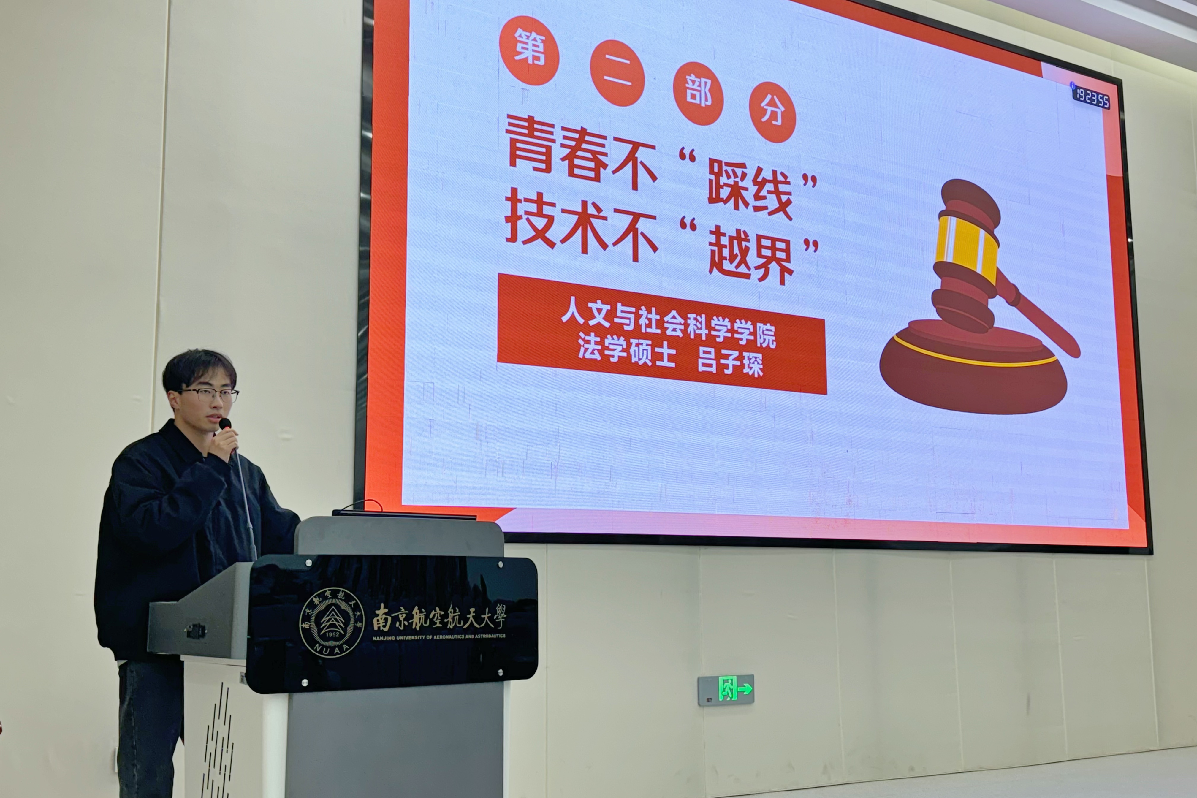 讲评第二环节,由南航法律援助中心吕子琛带来“青春不‘踩线’,技术不‘越界’”主题普法微课堂。吕子琛结合校园典型案例,重点分享了“违法偷拍”“帮信罪”“违法代码”“网络不当言论”等七类常见法律风险,解读相关法律法规,为同学们未来的技术探索划清了法律“红线”,指明了合规“航线”。