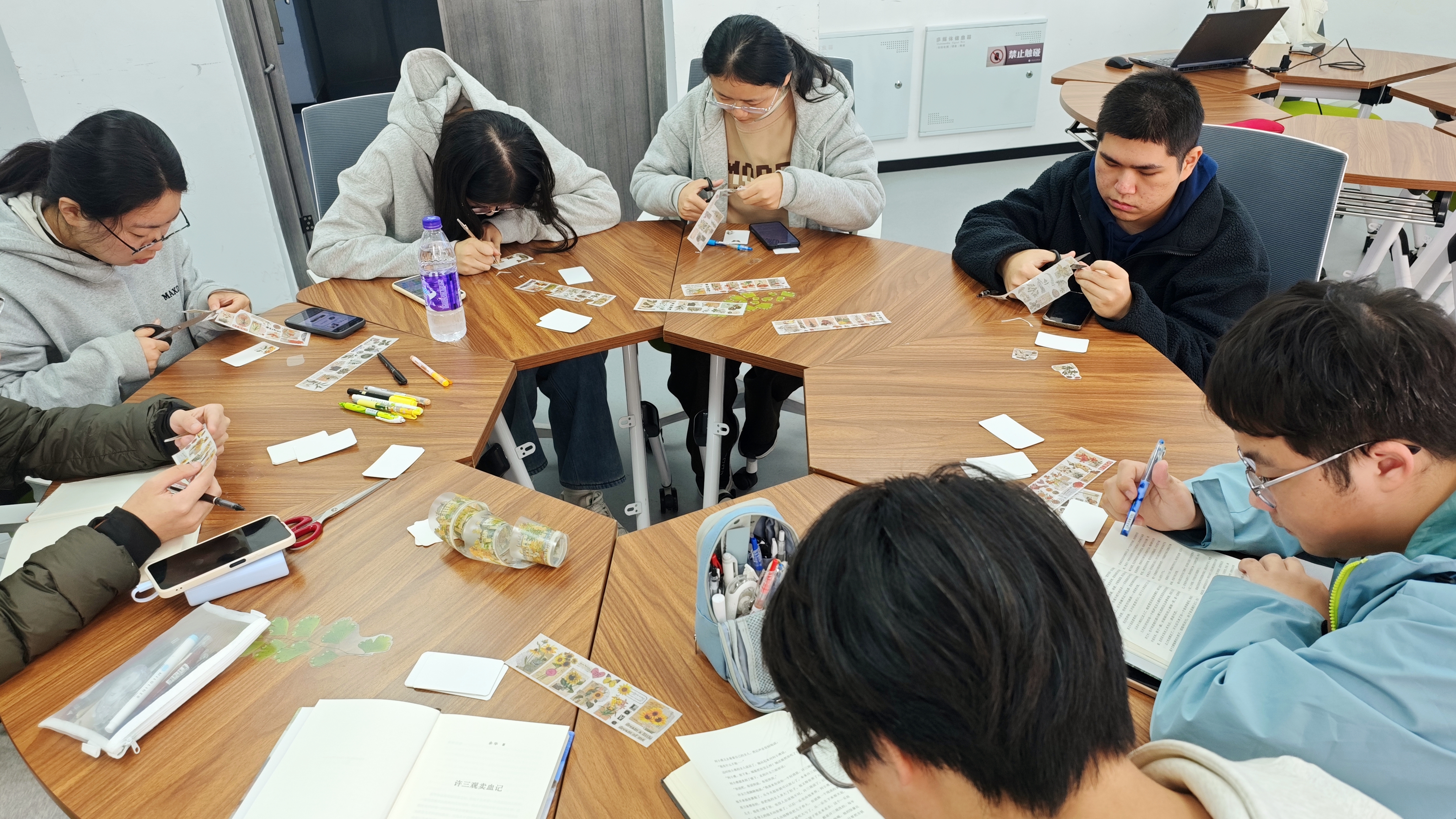 趣味热身过后,同学们迎来了充满创造力的“阅读明信片制作”环节。大家将自己的阅读感悟融入方寸明信片之中,或用鲜明色彩勾勒书中场景,或以简洁文字写下触动人心的金句。指尖翻飞间,一张张独具匠心的明信片逐渐成型,每一笔、每一划都承载着对阅读的热爱。